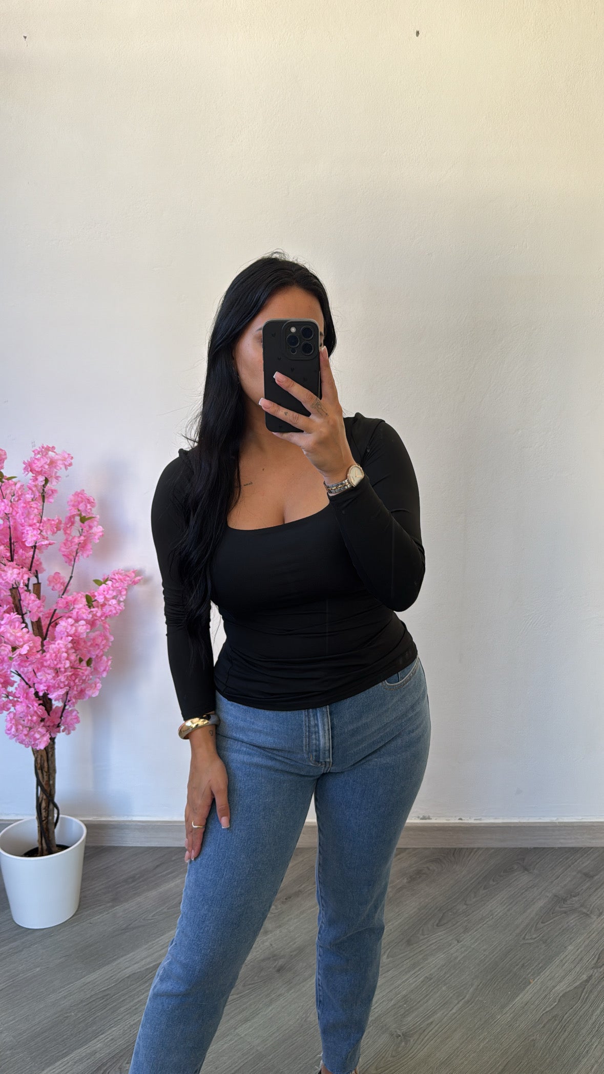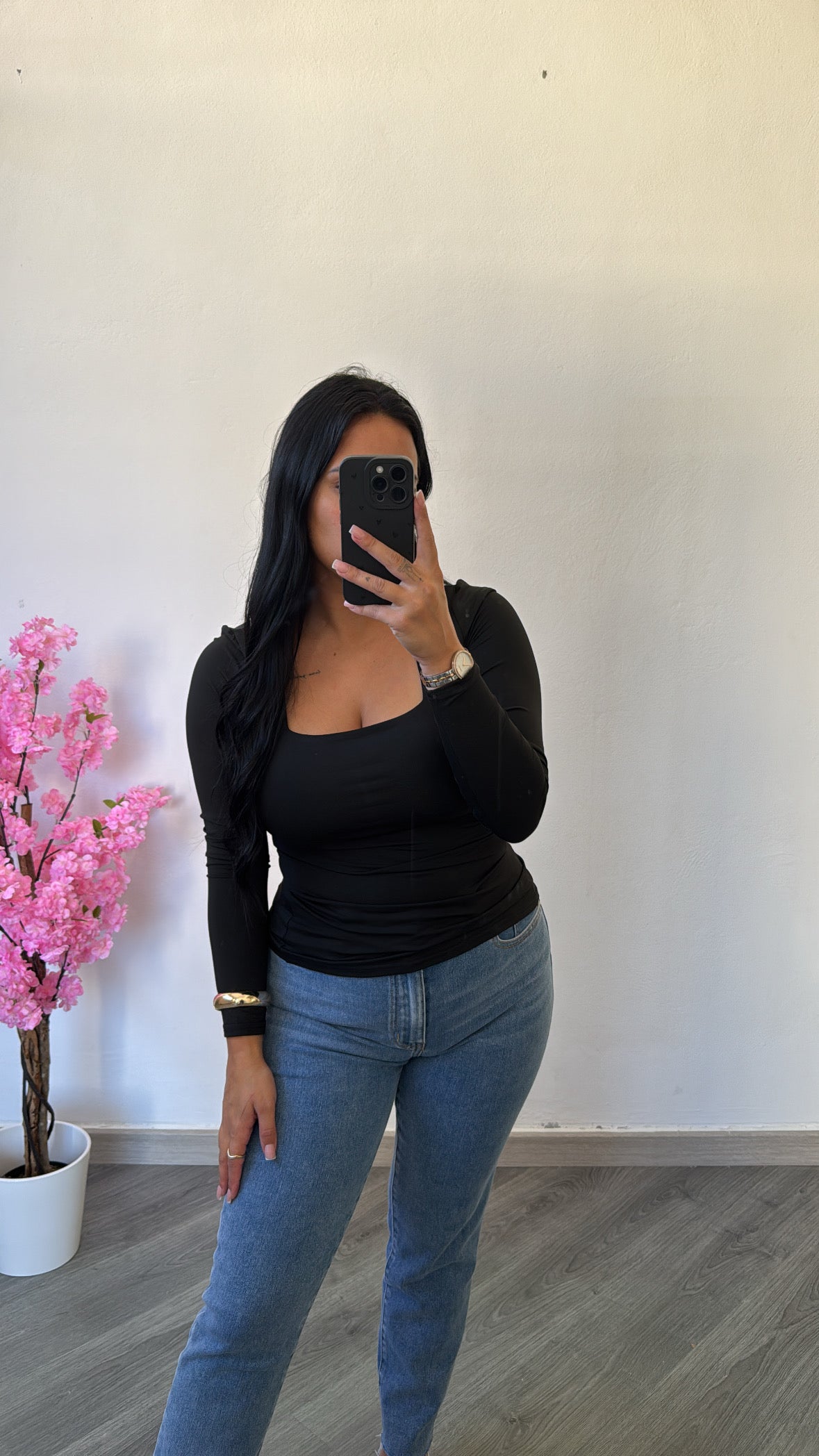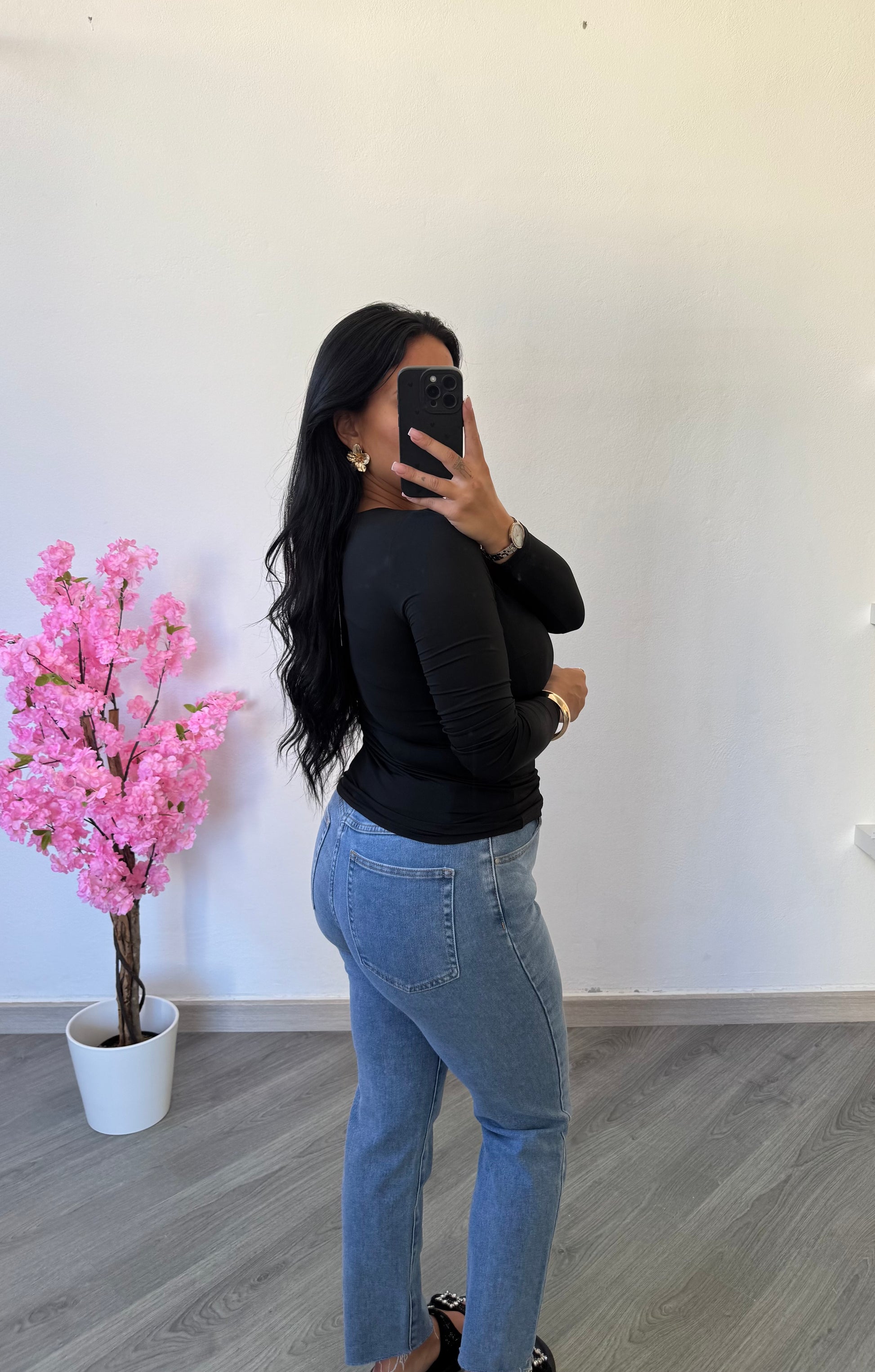 Esta camisola preta de manga comprida é a peça perfeita para compor looks elegantes e versáteis.