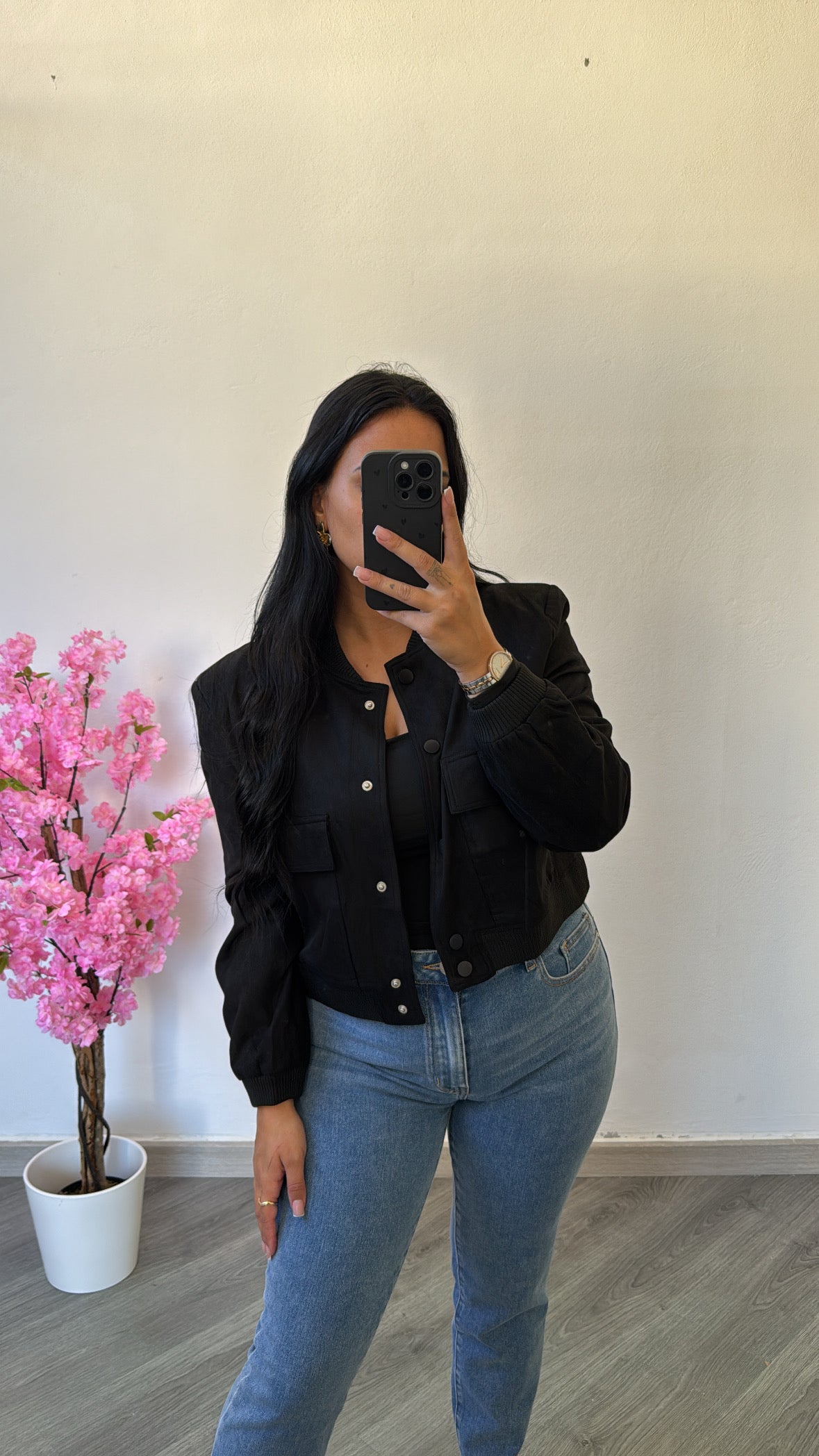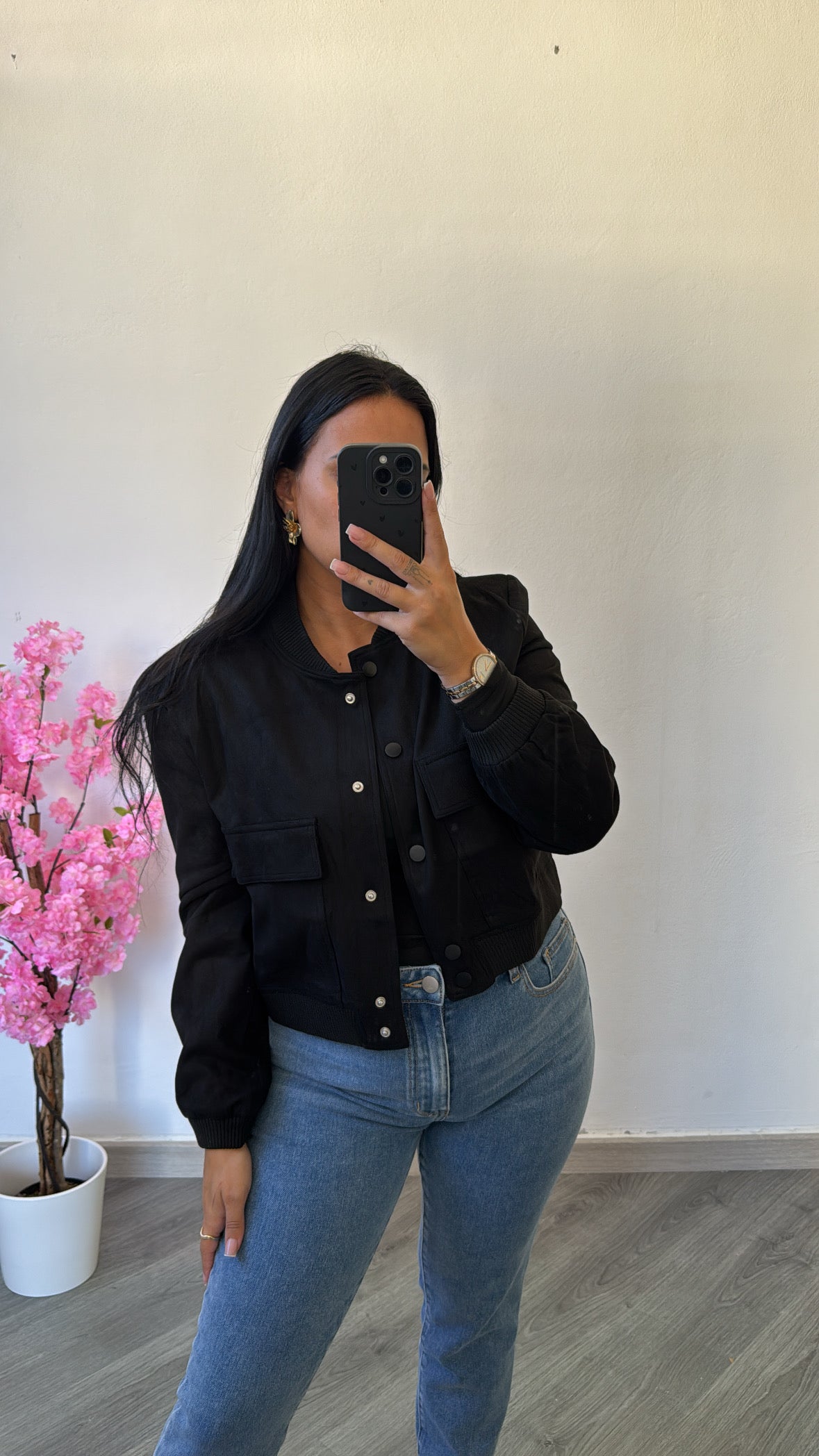 Moderno e estiloso, este blusão cropped em camurça preta é a escolha ideal para elevar qualquer look.
