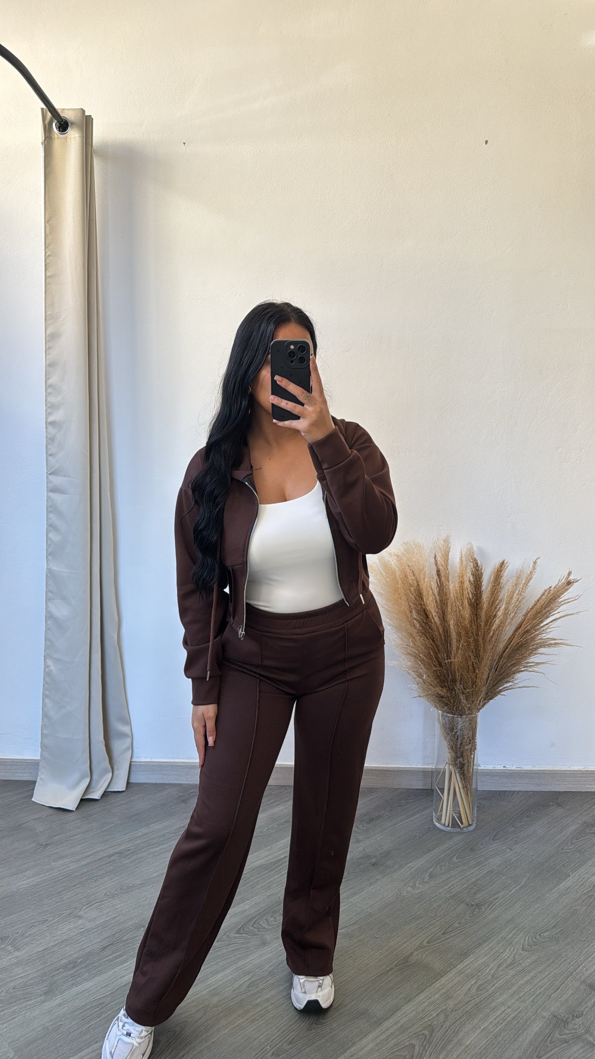 Composto por um casaco com capuz e zíper frontal e uma calça de cintura alta e corte reto, o look valoriza a silhueta e garante um visual sofisticado mesmo nas produções mais casuais