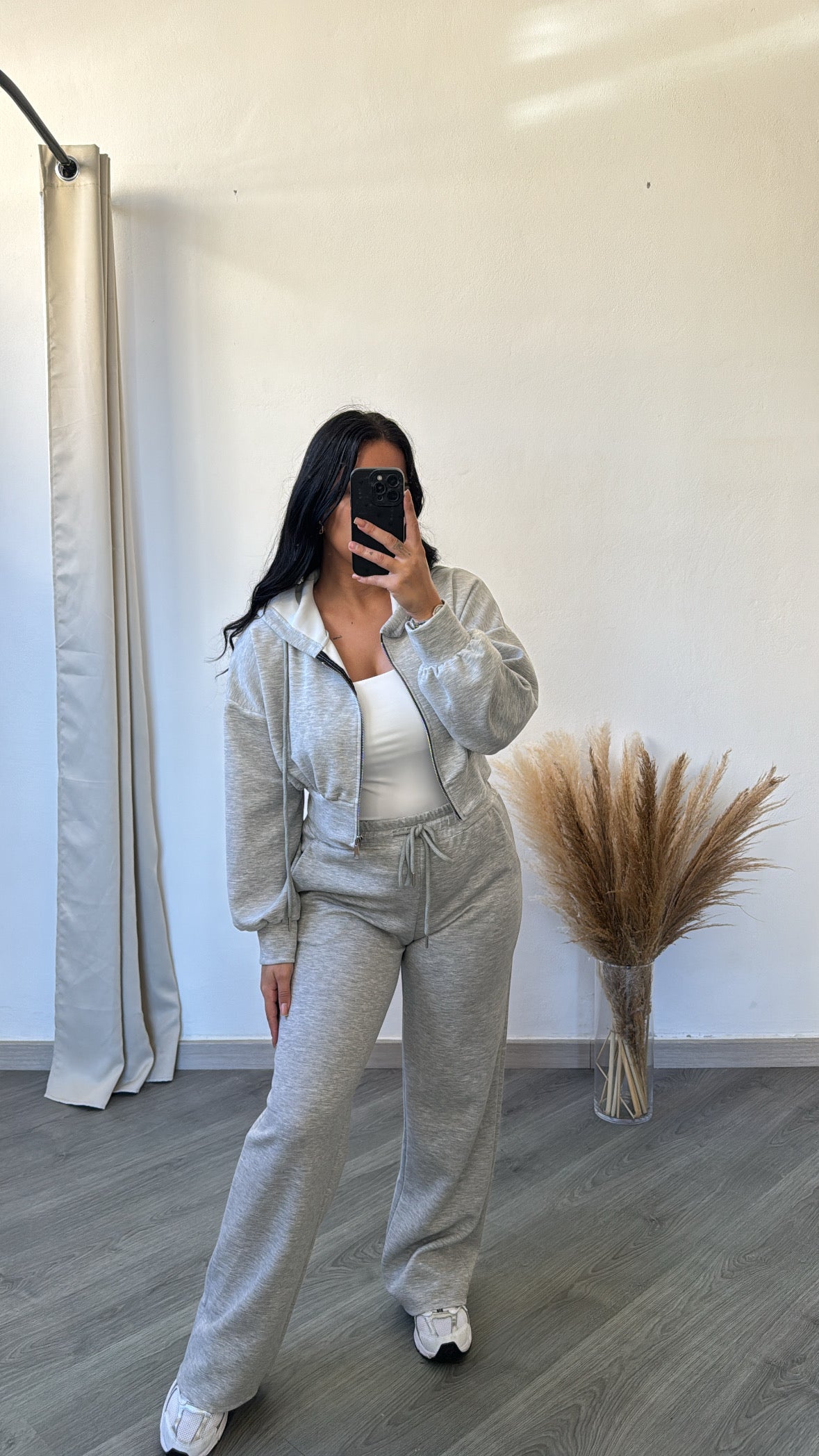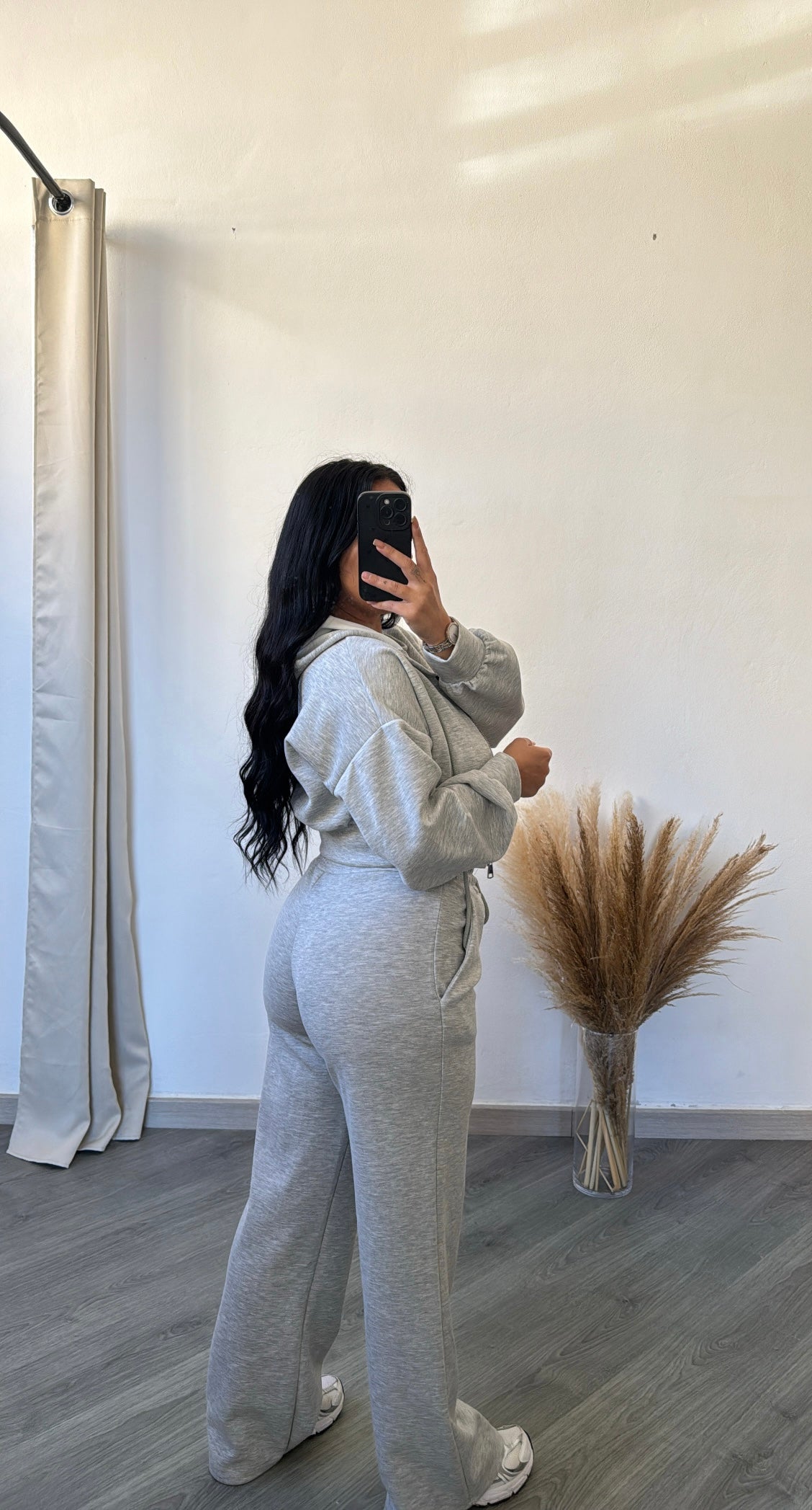 Composto por um casaco com capuz e zíper frontal e uma calça de cintura alta e corte reto, o look valoriza a silhueta e garante um visual sofisticado mesmo nas produções mais casuais