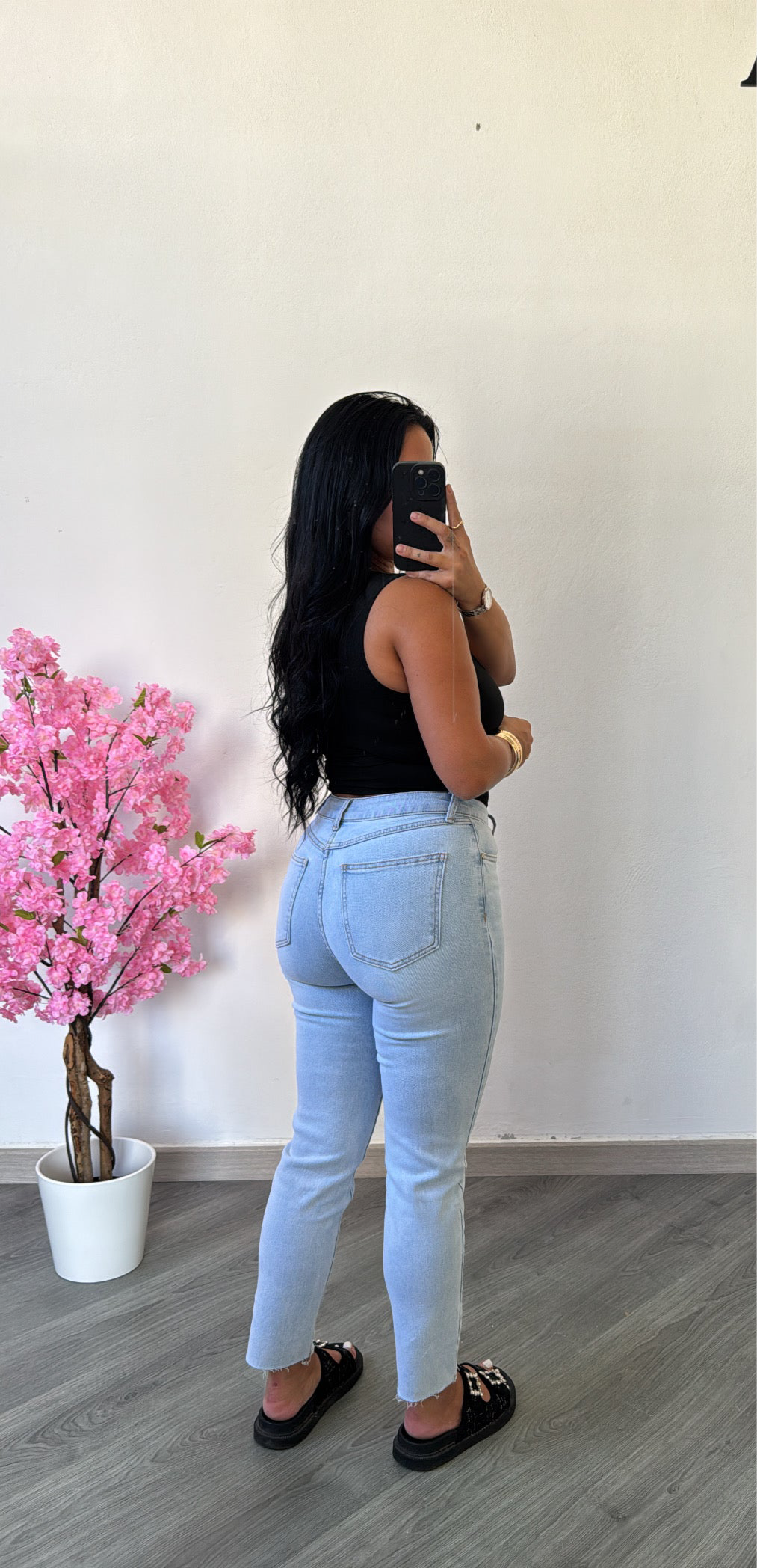 Calça jeans mom feminina, confeccionada em denim azul claro com cintura alta que valoriza a silhueta.