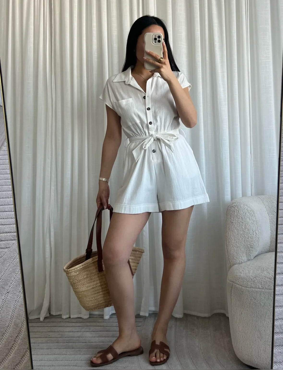 Macacão curto branco em algodão, com gola de camisa e botões frontais em contraste.