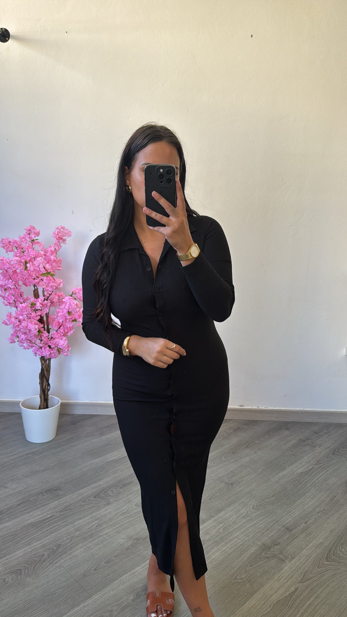 Vestido de malha canelada, de manga comprida, com gola e fecho frontal de botões ao longo de toda a peça.