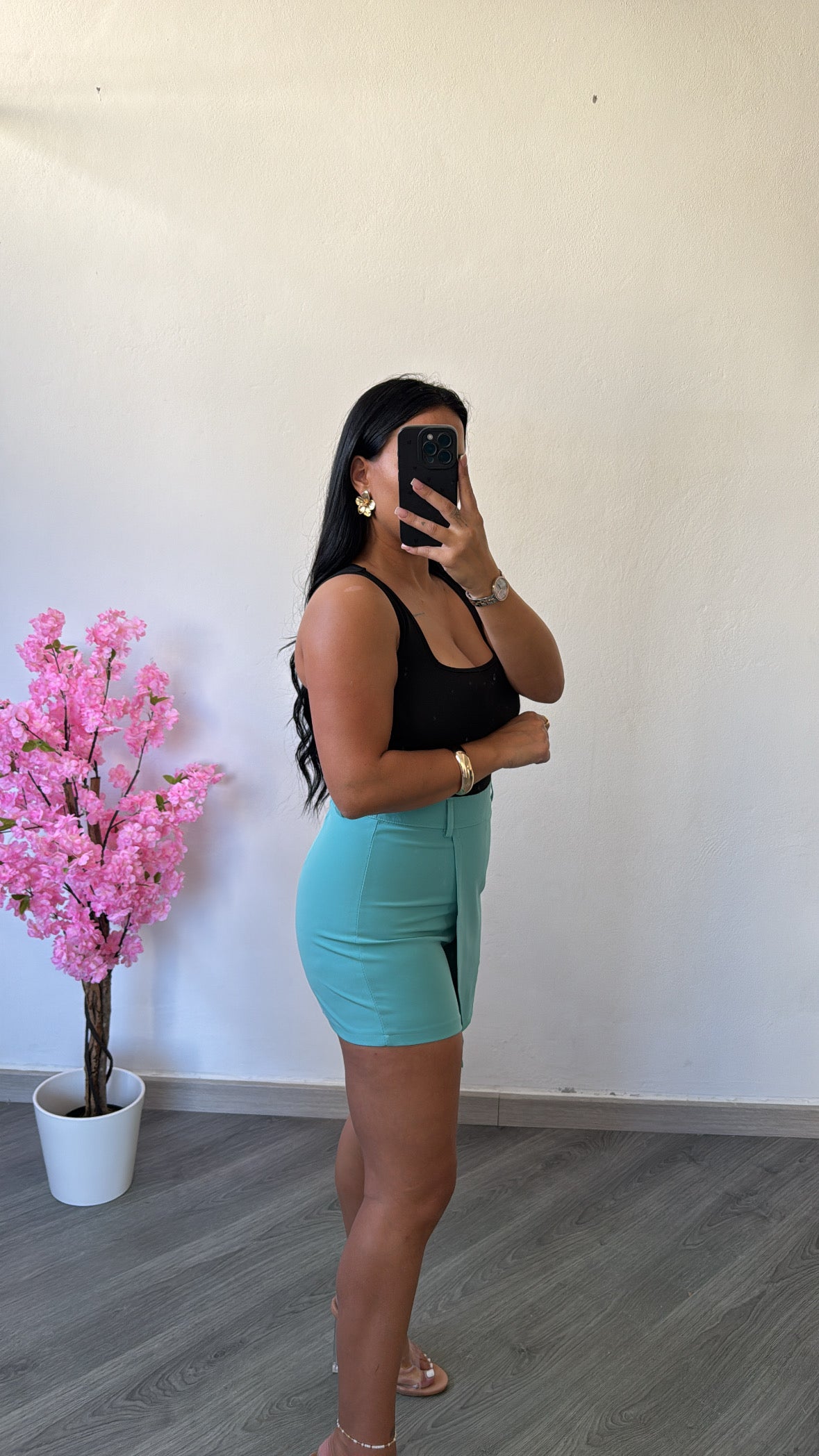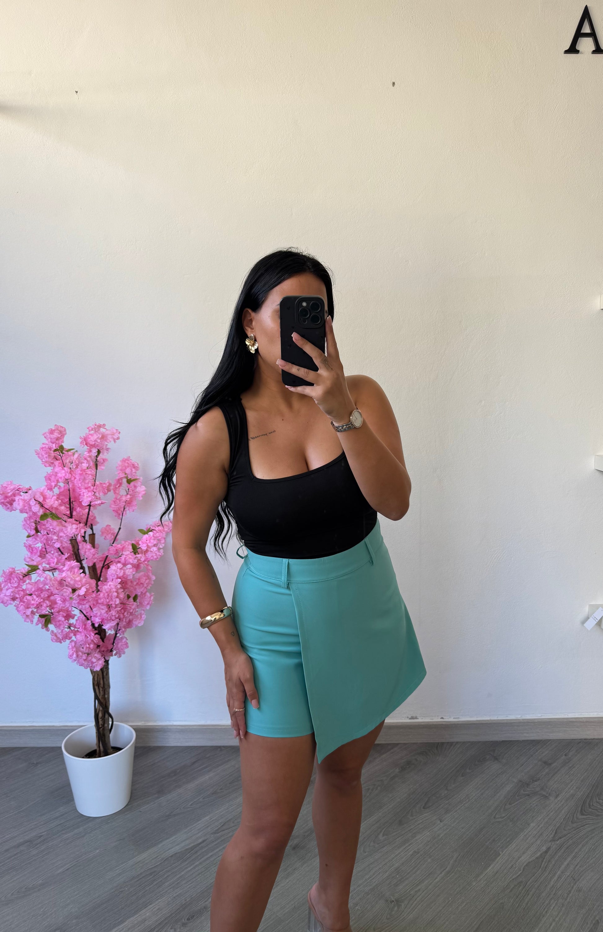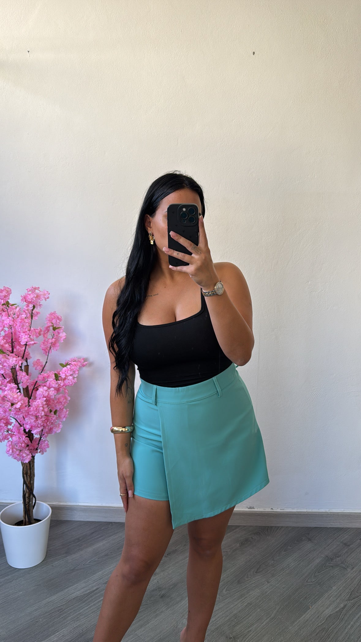 Saia-calção moderna em tom azul, com design assimétrico que combina o estilo da saia com o conforto do short.