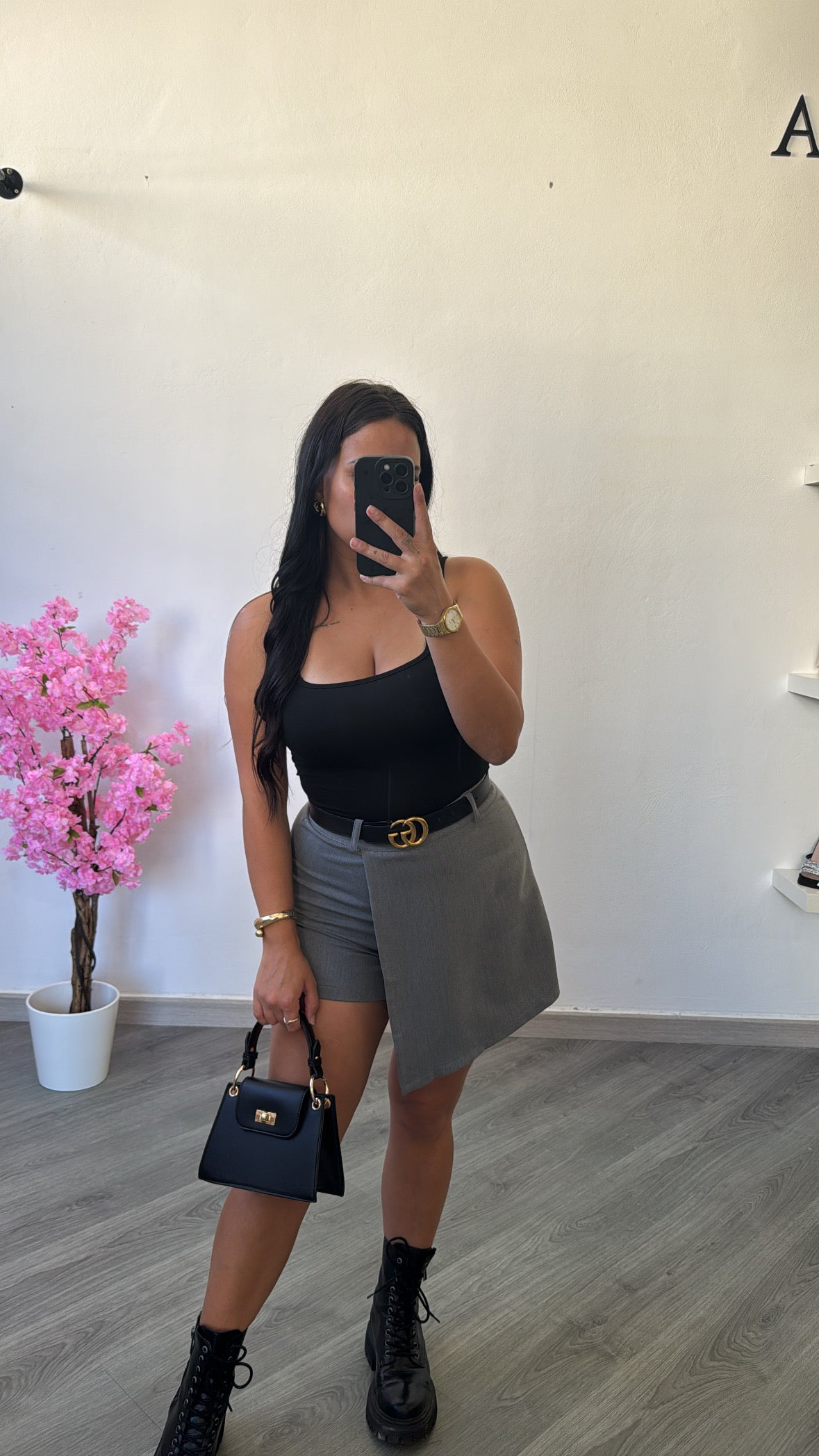 Saia-calção moderna em tom cinza, com design assimétrico que combina o estilo da saia com o conforto do short.