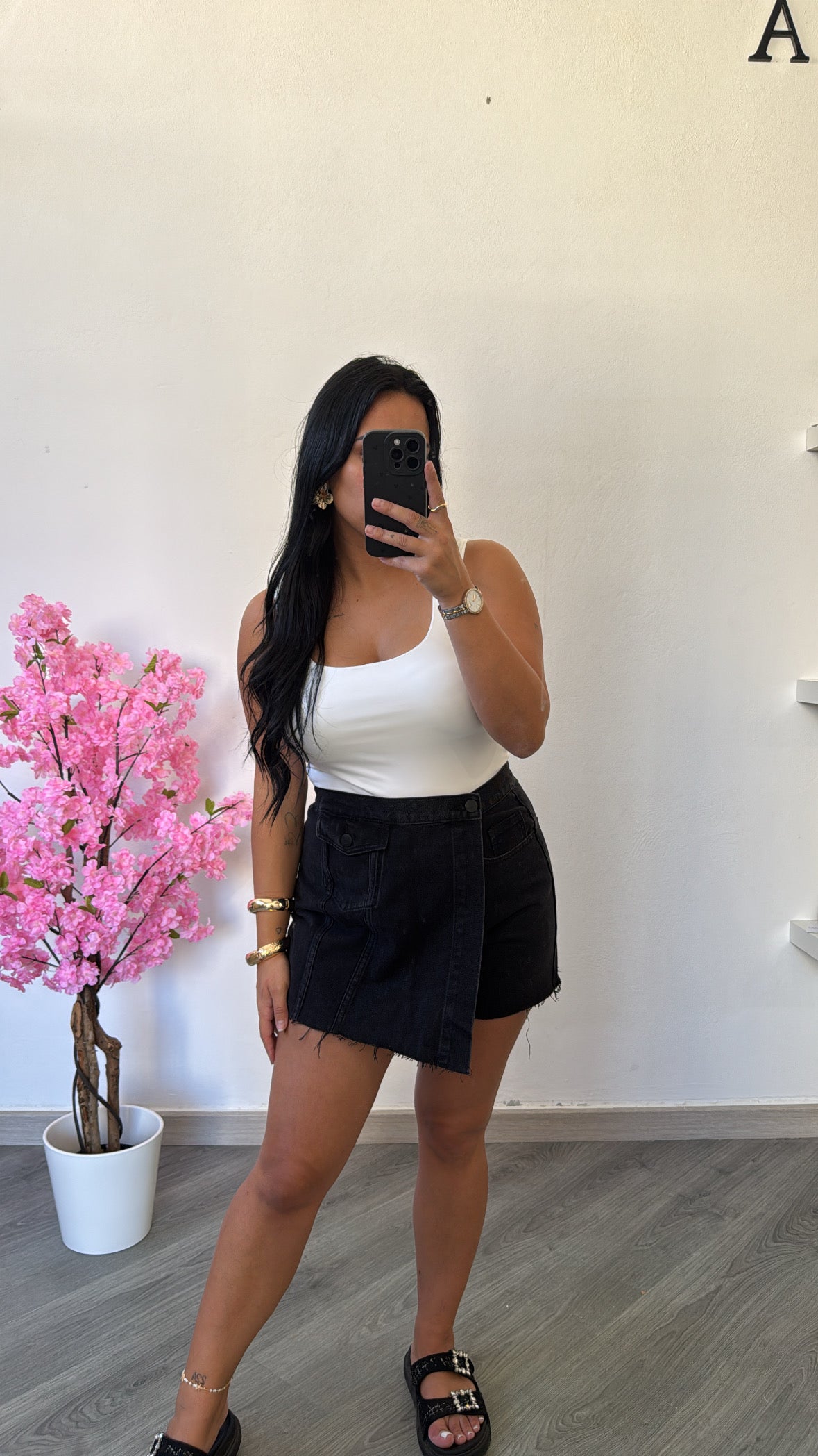Saia-calção feminina, confeccionada em denim preto com design moderno e detalhe assimétrico na frente.