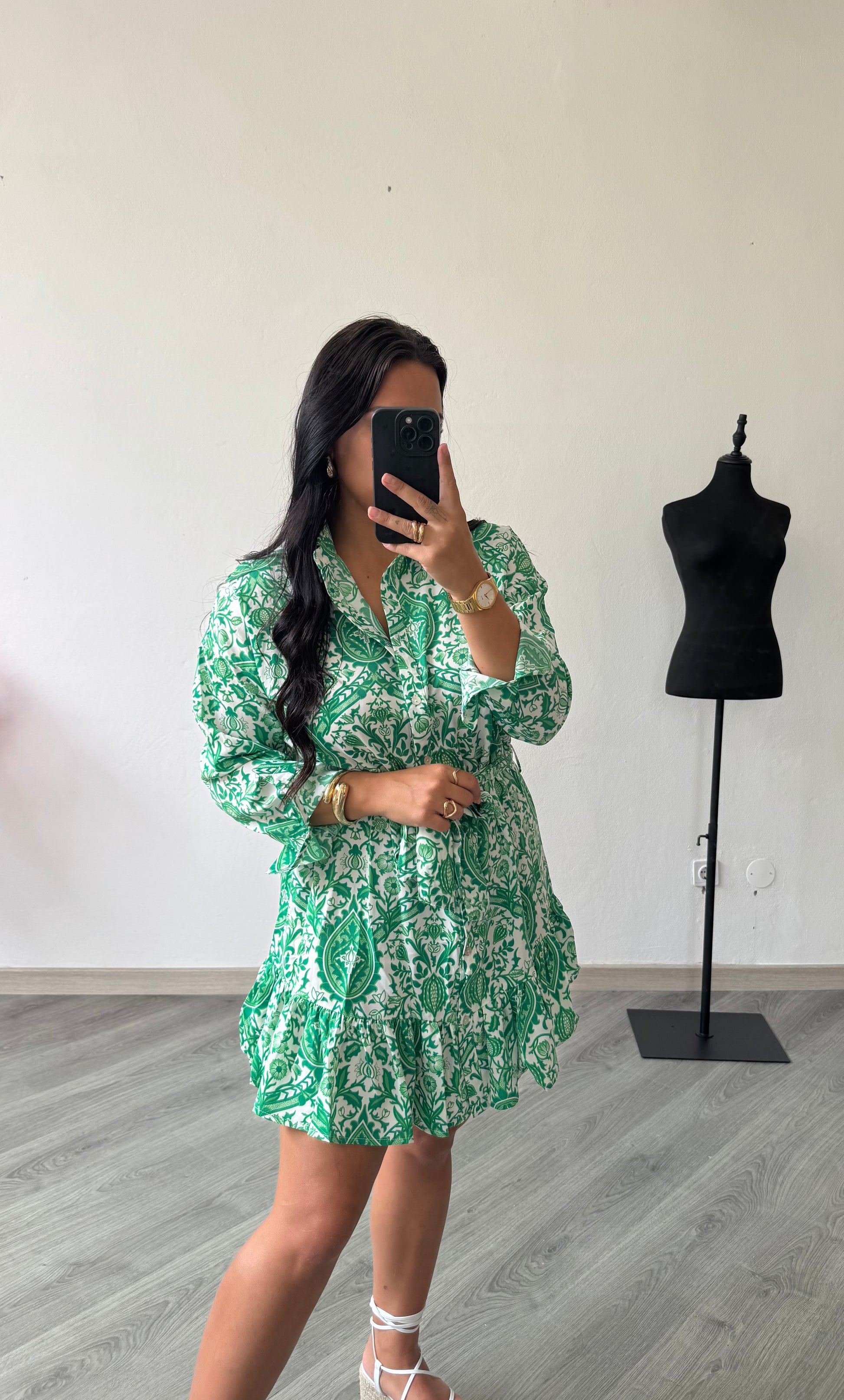 Vestido curto feminino com estampado verde e branco em padrão floral e geométrico.
