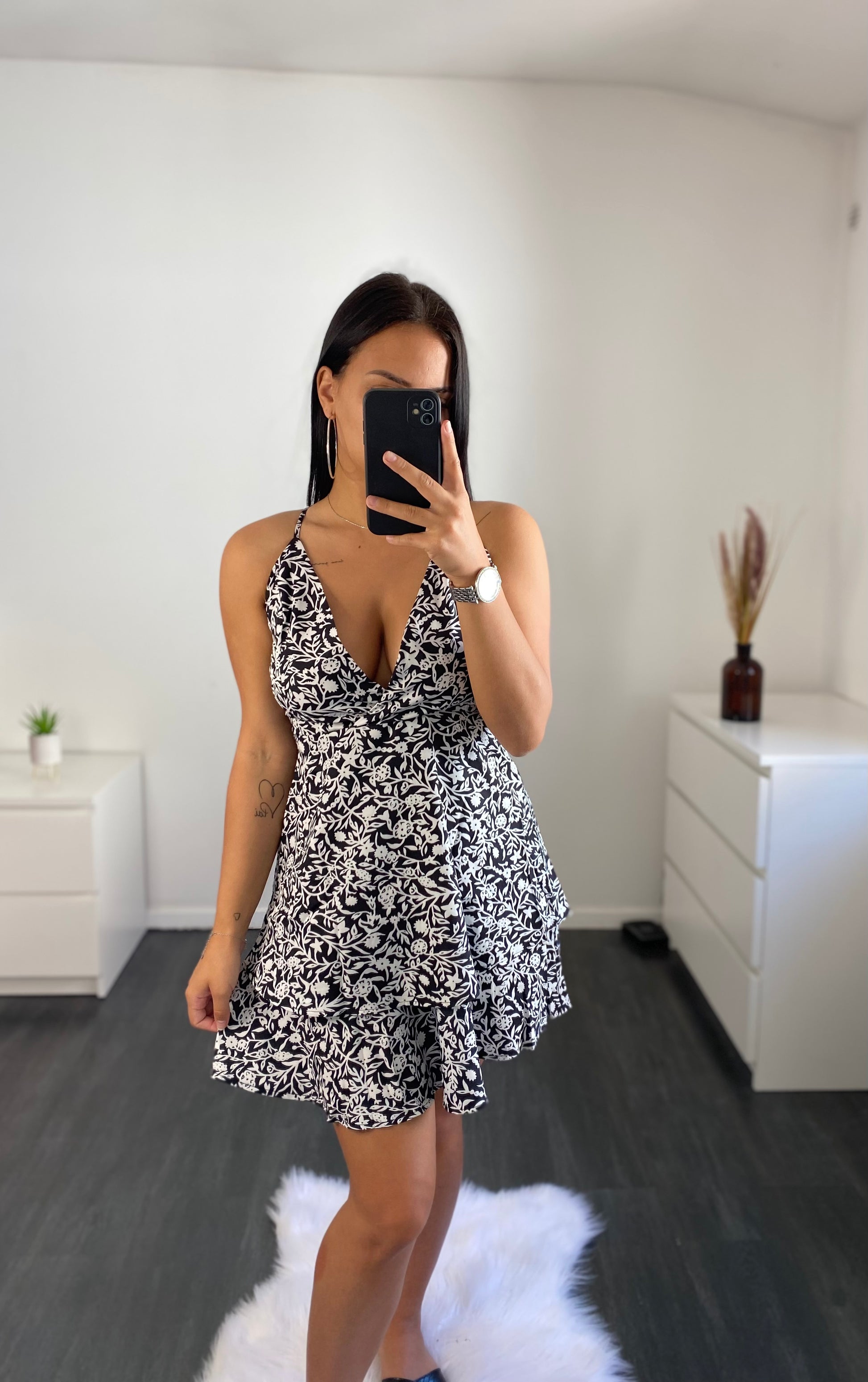 Estampa floral em preto e branco, detalhe em babados na saia e alças cruzadas nas costas, garantindo um visual delicado e elegante.