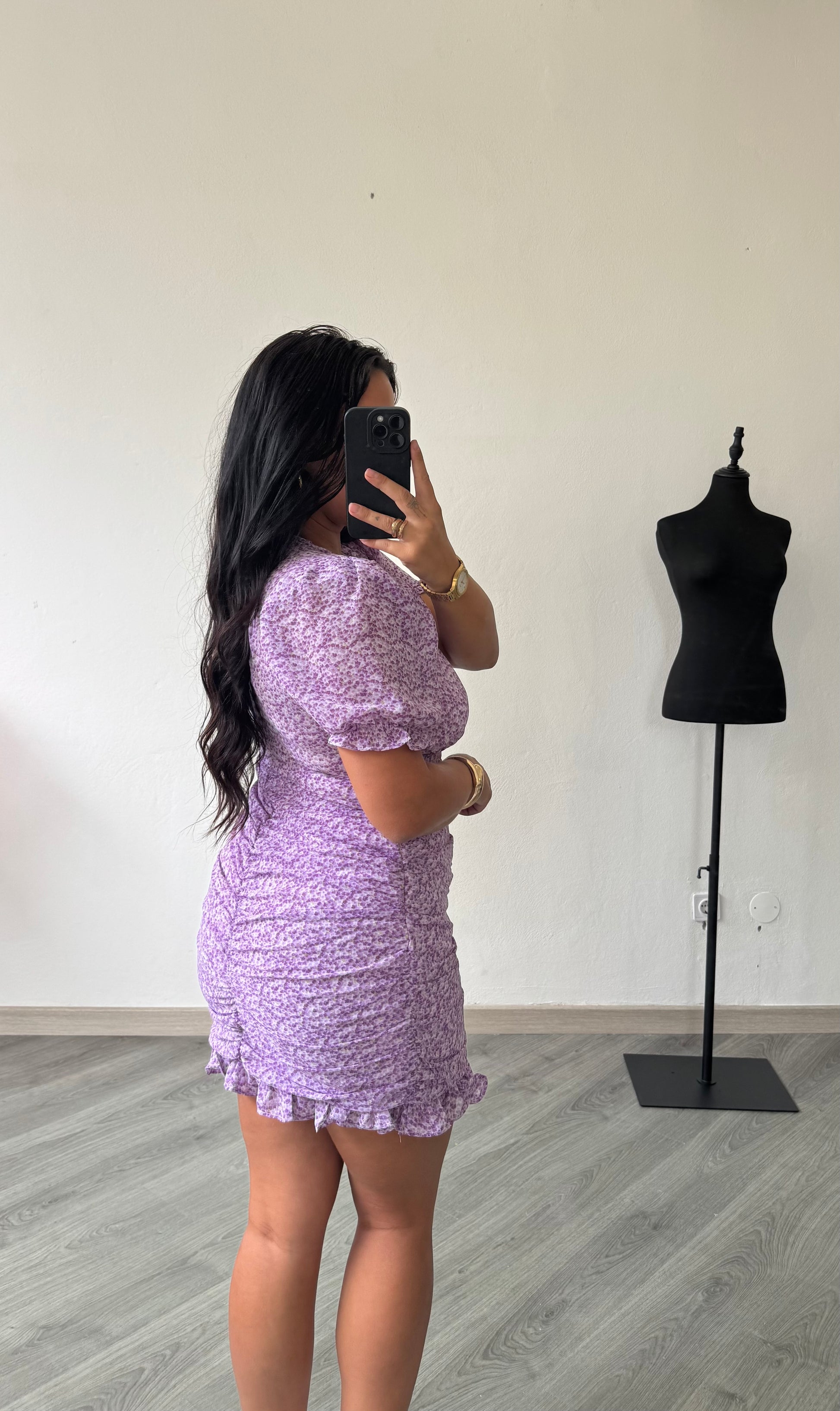 Vestido curto em tons de lilás com estampa floral delicada.